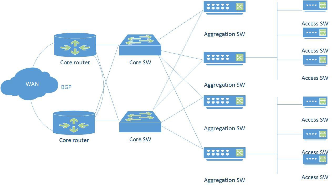 The solution adopts the networking of three layers, including the core router and theswitch, the aggregation switch and the access switch. Both the core router and the core switch adopt the two-node backup. The aggregation switch is connected to the two coreswitches which can work as standby for the other. Therefore, one core switch in trouble has no impact on the network. The core router and the core switch are connected by the10G optical fiber. The aggregation switch uplinks with the core switch by the 10G optical fiber anddownlinks with the access switch by the Gigabit opticalfiber.